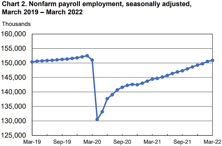 Total nonfarm payroll employment rose by 431,000 in March, as job gains continued in leisure and hospitality, professional and business services, retail trade, and manufacturing. Overall, job growth averaged 562,000 per month in the first quarter of 2022, the same as the average monthly gain for 2021. However, employment is down by 1.6 million, or 1.0 percent, from its pre-pandemic level in February 2020.